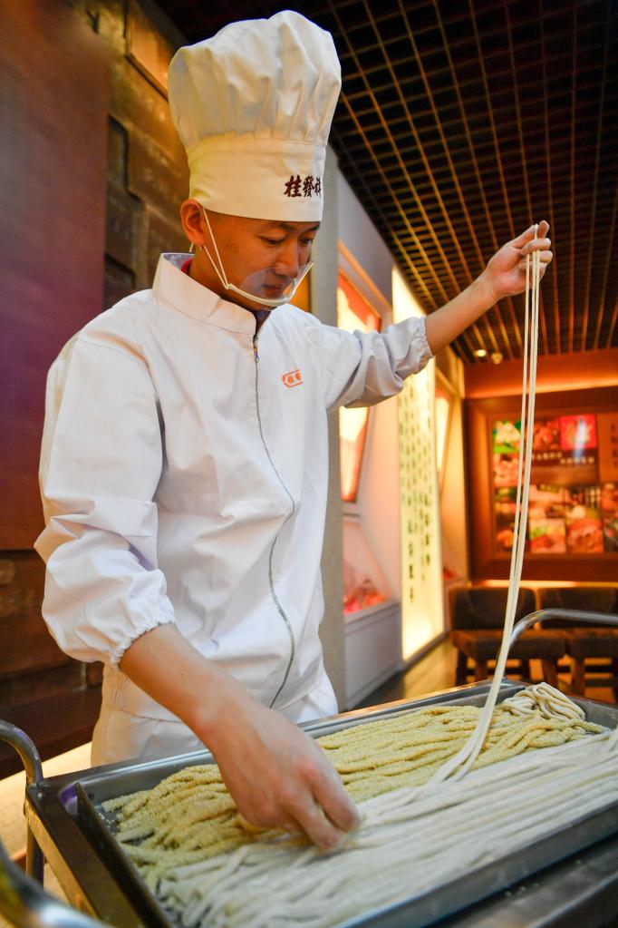 在天津桂發祥十八街麻花文化館,趙寶陽完成手工麻花制作中白條和麻條的制作步驟(6月8日攝)。