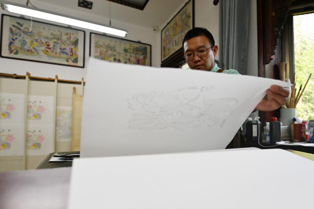 霍樹林在天津市西青區的楊柳青霍氏古一張畫店準備進行勾線(6月6日攝)。