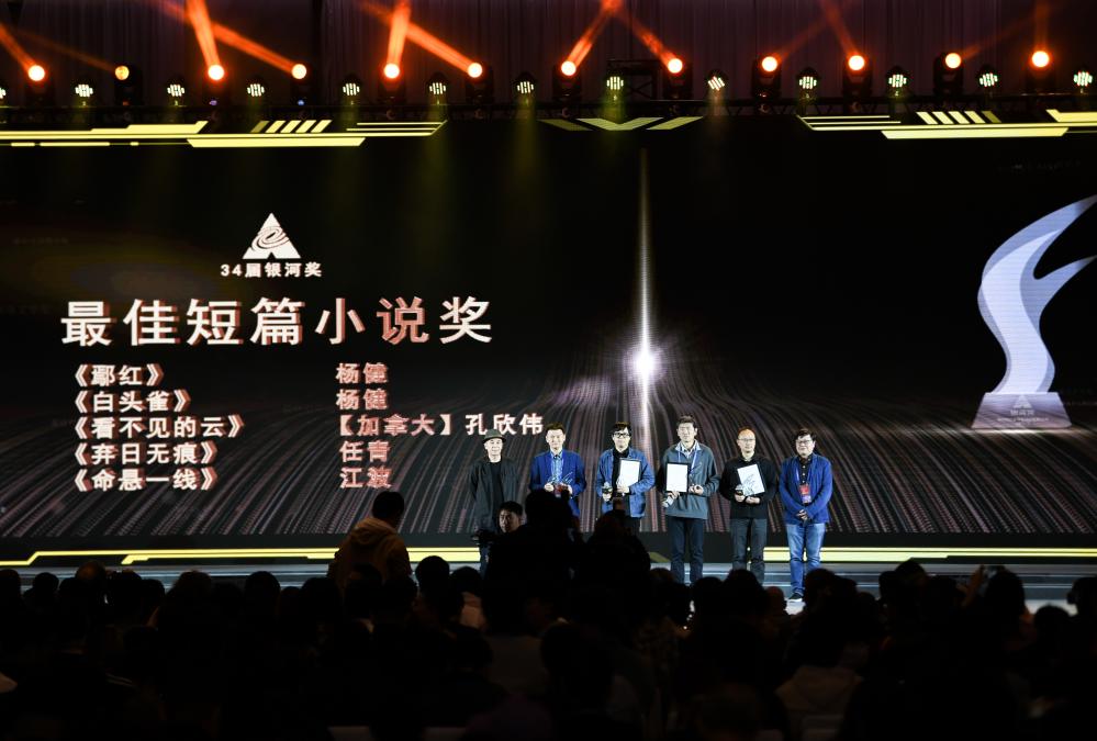 10月19日晚,在第34屆中國科幻銀河獎頒獎典禮上,獲得最佳短篇小說獎的楊?。ㄗ蠖┥吓_領獎。新華社記者 王曦 攝