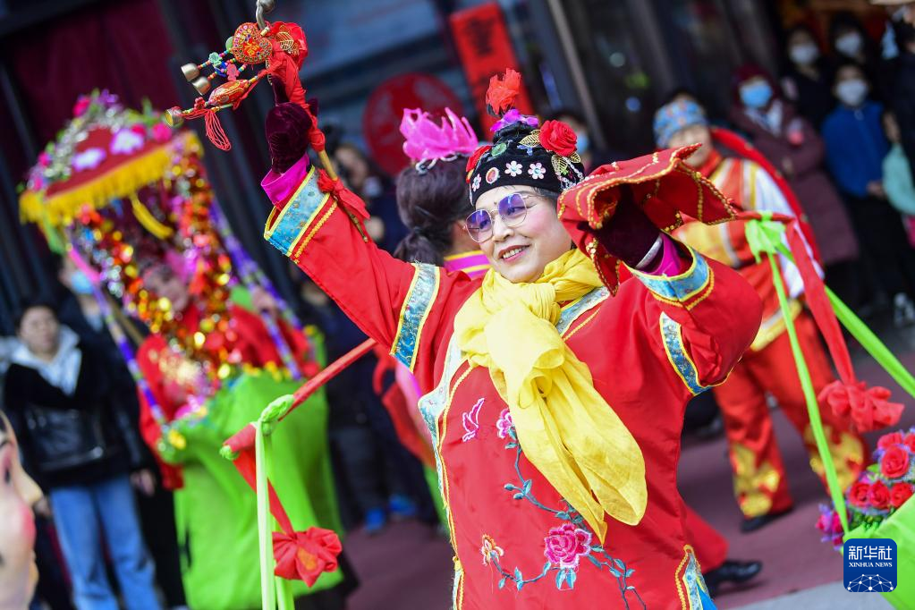 2月5日,演員在手造年貨大集上表演山東大秧歌。