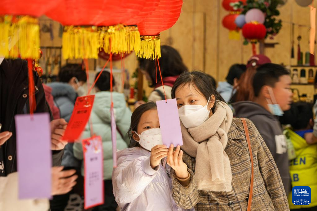 2月5日,游客在山東手造年貨大集上猜燈謎。