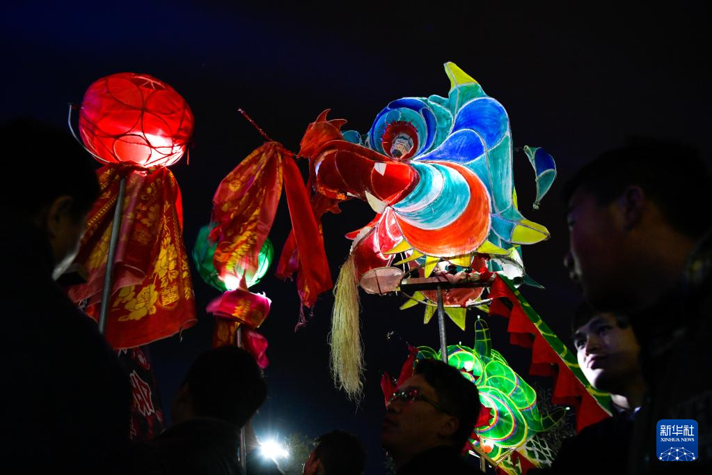 2月4日晚,在臺江縣,人們在參加苗族“舞龍噓花”活動時拿著花燈等待入場。