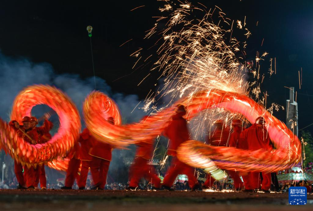 苗族“舞龍噓花”是當地人用土火藥和楠竹等制成噓花筒向舞動的彩龍噴射所形成的絢麗景象。2021年,苗族“舞龍噓花”習俗入選國家級非物質文化遺產名錄。