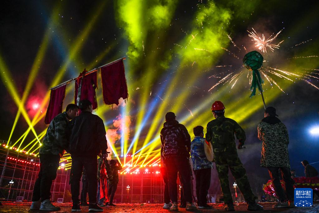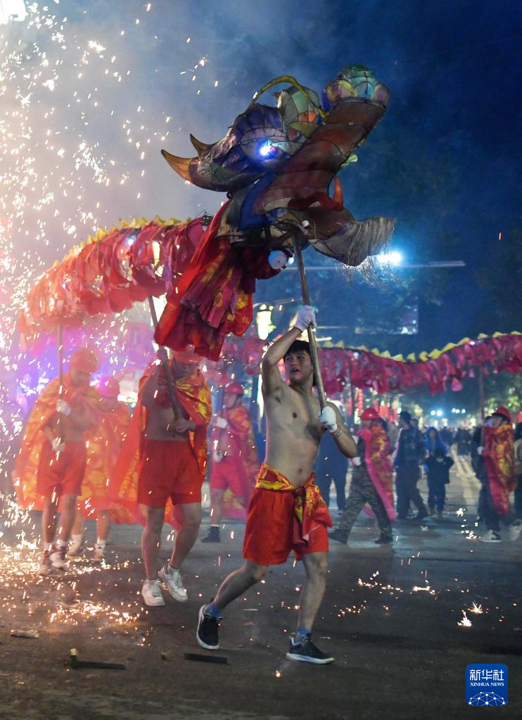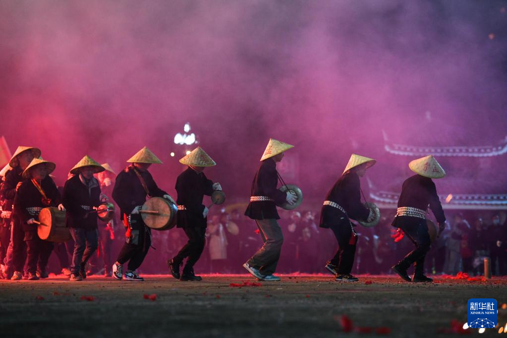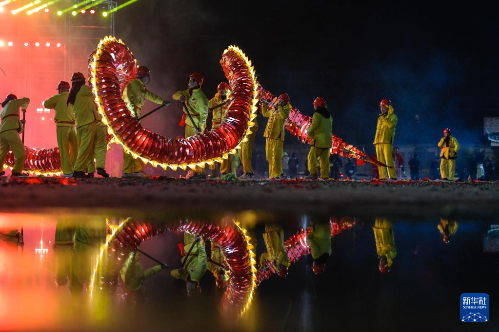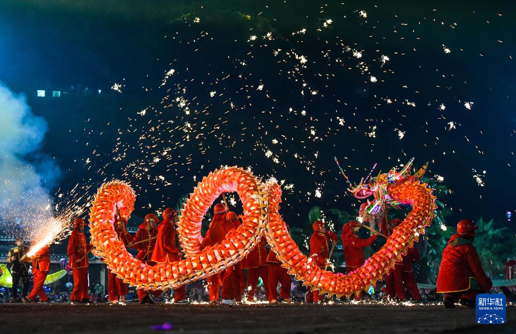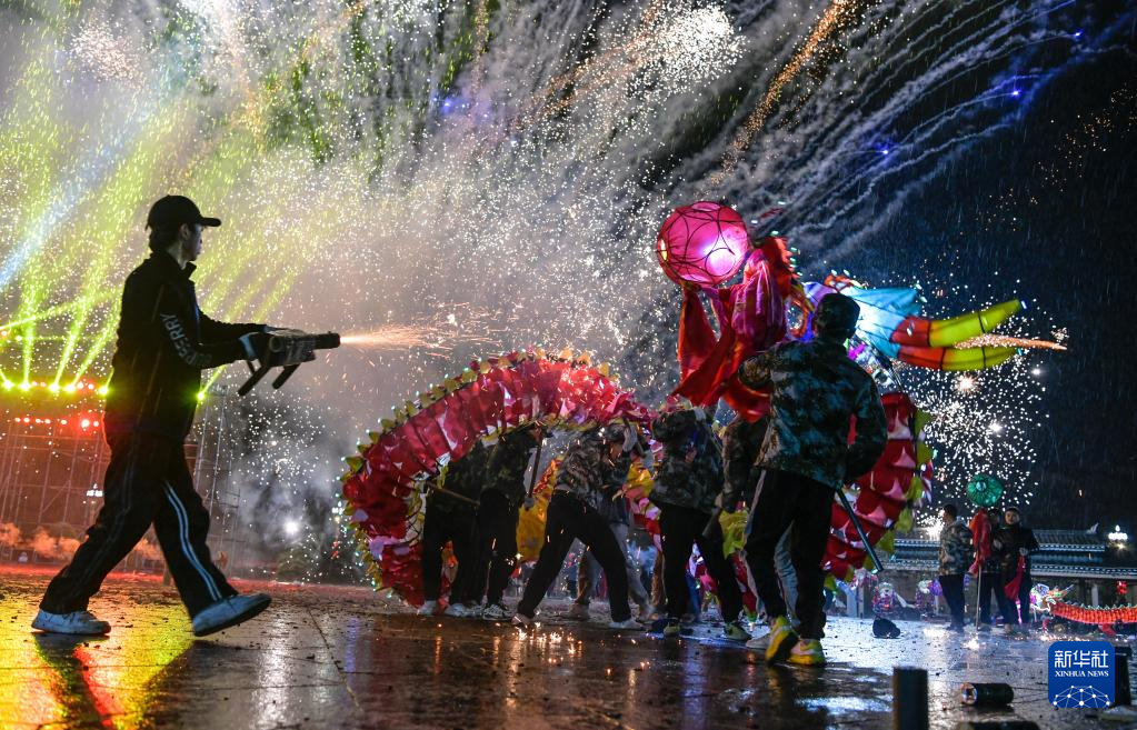 2月4日晚,人們在臺江縣參加苗族“舞龍噓花”活動。