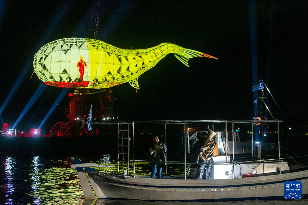 2月4日,在希臘雅典西部的埃萊夫西斯,人們在船上演奏音樂,慶祝2023“歐洲文化之都”活動開啟。