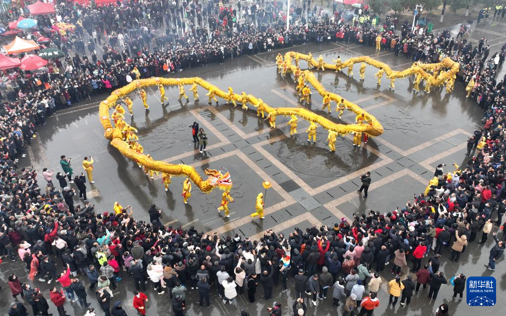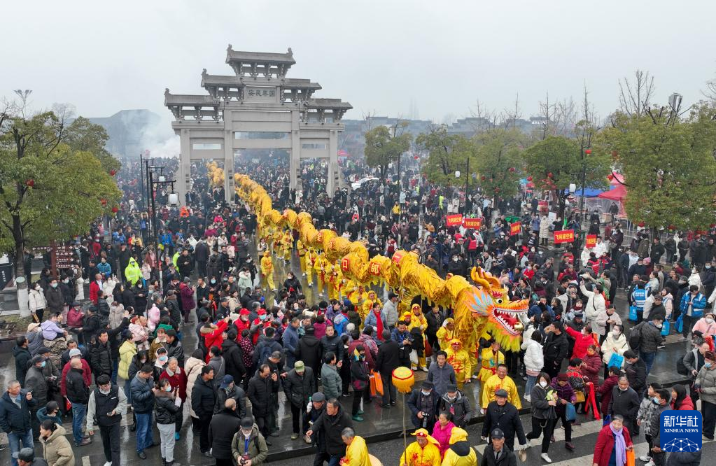 2月6日,人們在全椒縣太平文化廣場觀看舞龍表演(無人機照片)。