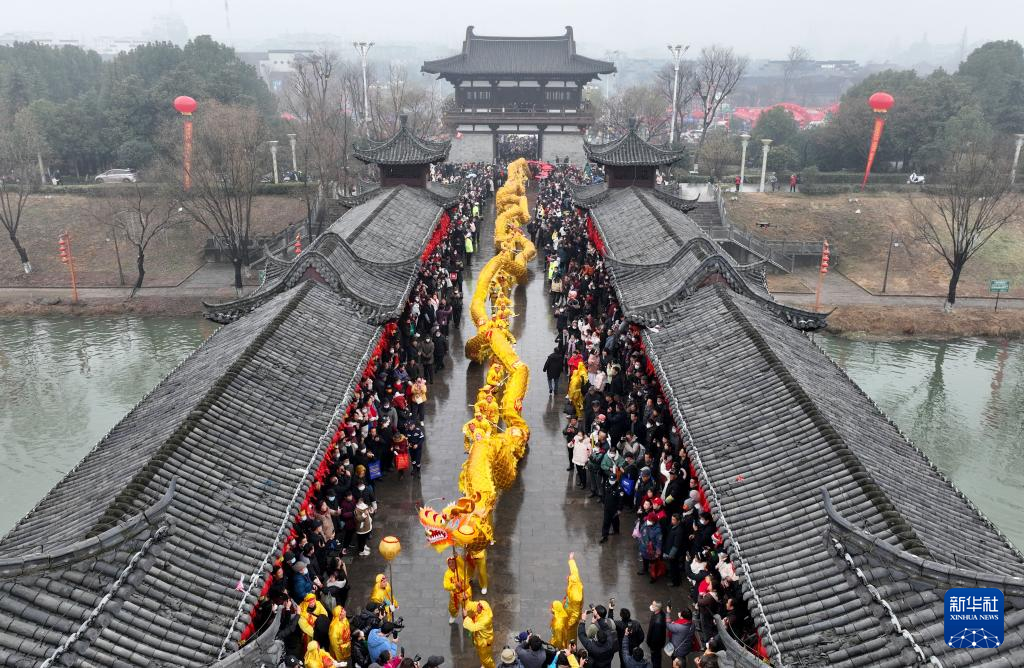 當日,安徽省全椒縣傳統民俗活動正月十六“走太平”拉開帷幕,巡游隊伍穿過太平橋,獻上精彩紛呈的民俗表演。