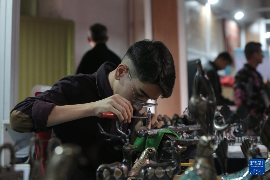 2月7日,參展商在伊朗德黑蘭展示手工藝品制作技藝。