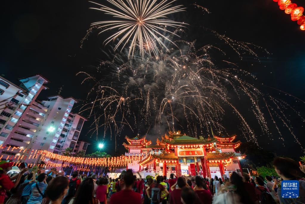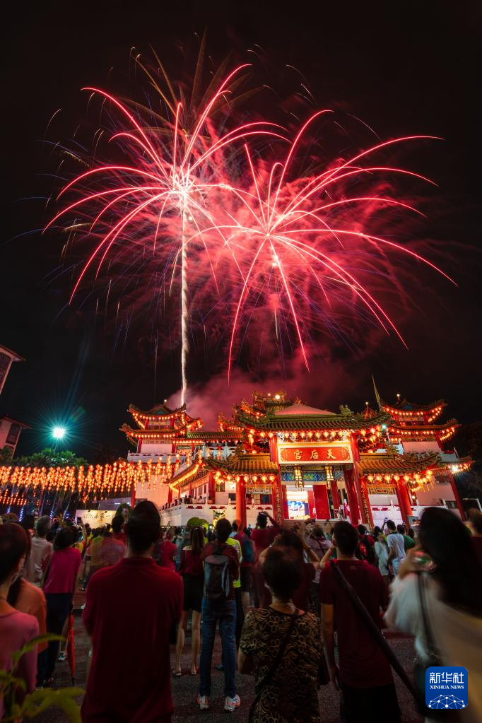 2月5日,民眾在馬來西亞吉隆坡天后宮觀賞煙花。