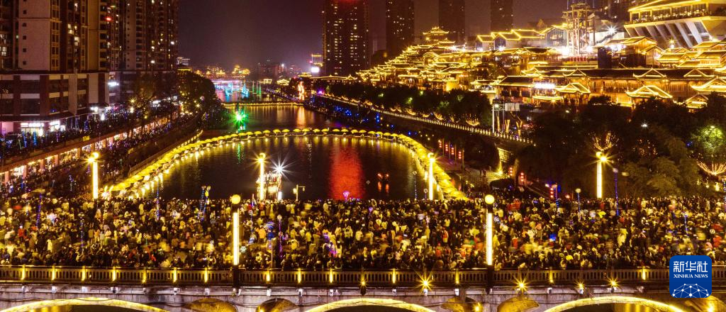 2月5日晚,湖北省宣恩縣仙山貢水旅游區的貢水河畔人山人海(無人機照片)。