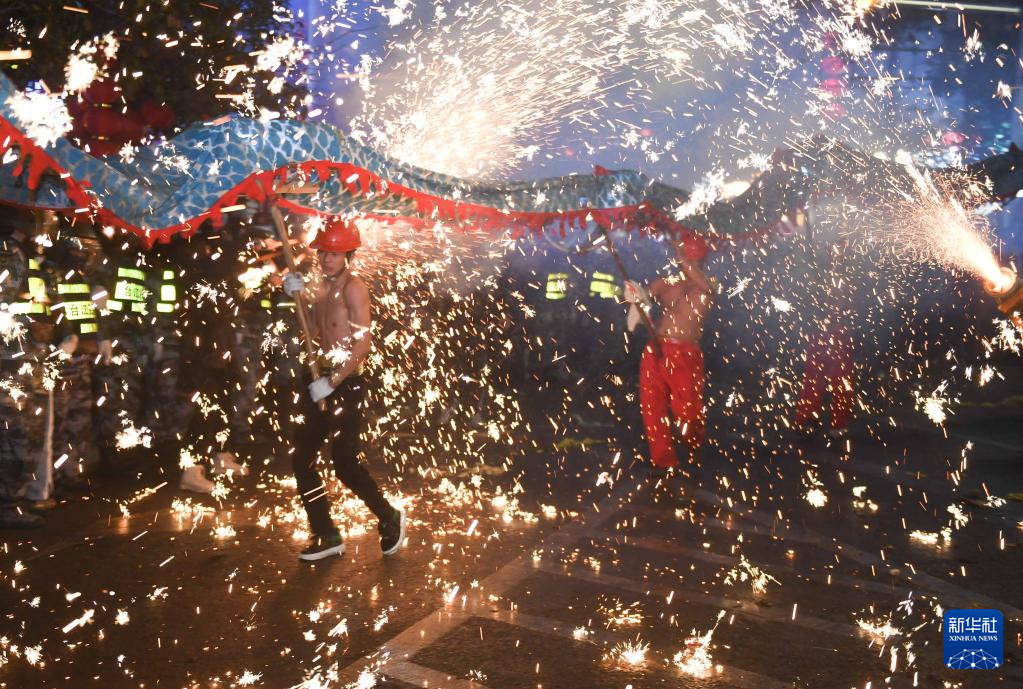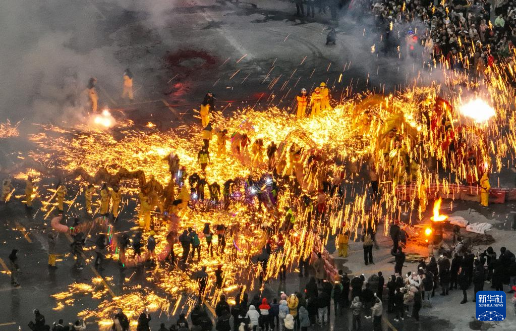 2月5日,在貴州省遵義市新蒲新區新蒲街道中橋村,人們在鐵花中舞龍(無人機照片)。