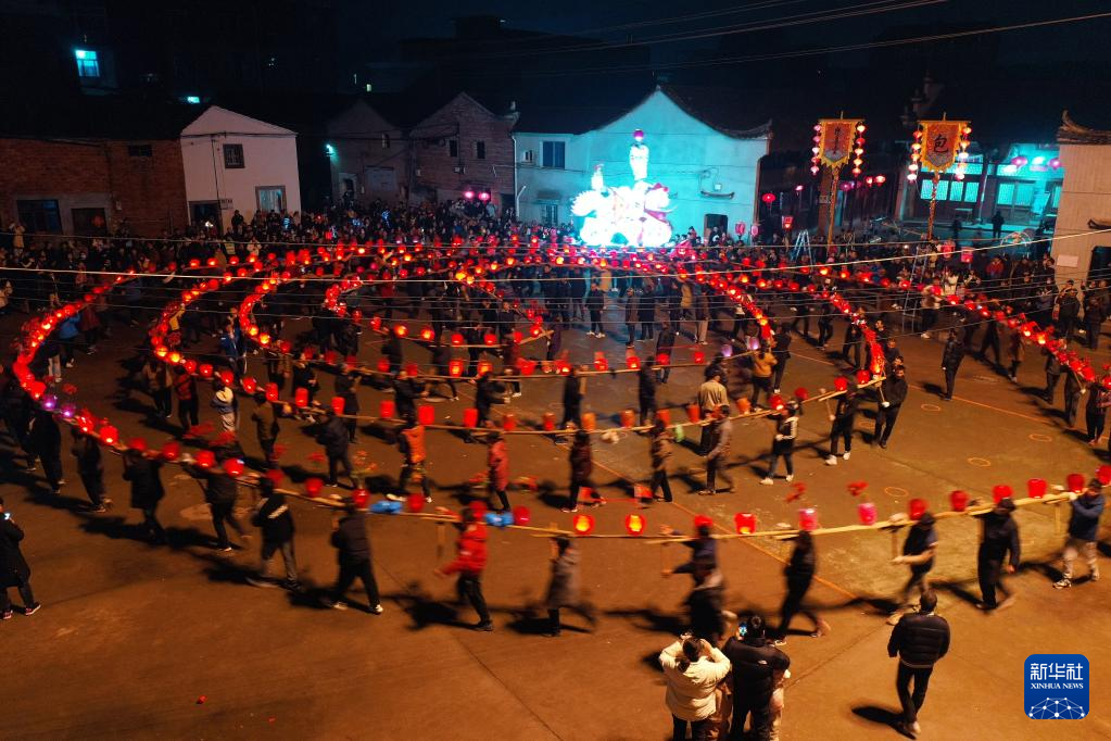 2月5日晚,浙江省東陽市南馬鎮防軍村的村民們在迎龍燈鬧元宵(無人機照片)。