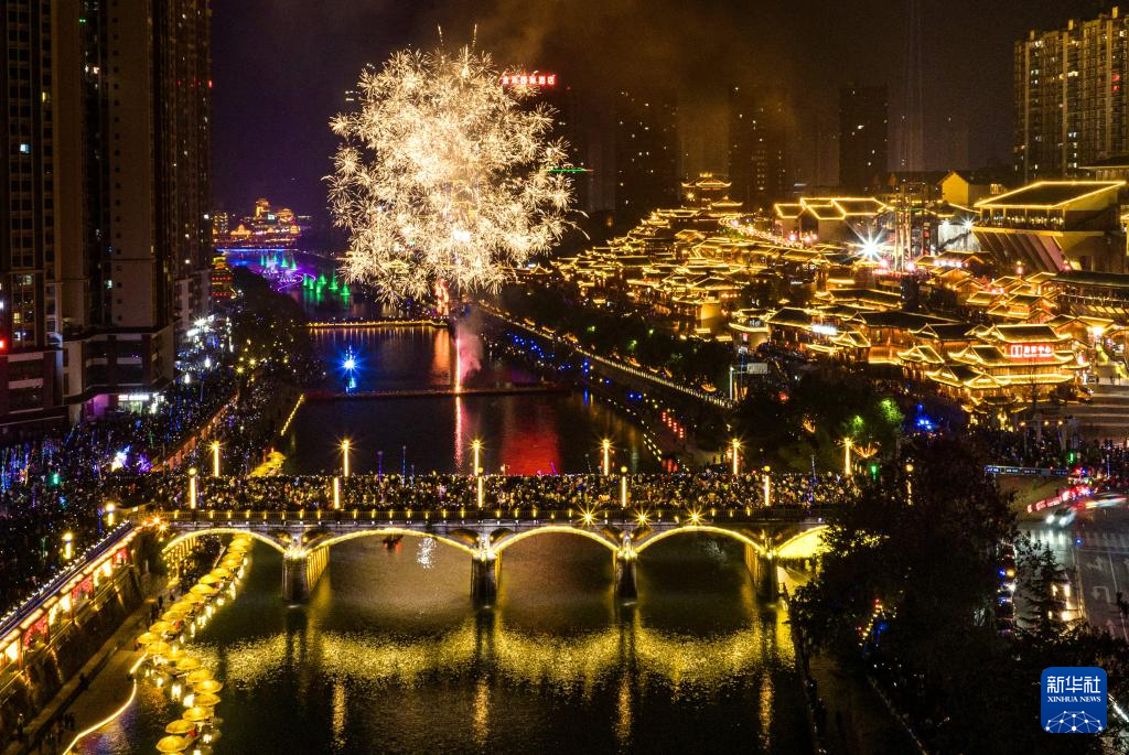 2月5日,河南省南陽市中心城區白河上空,璀璨奪目的煙花在高空絢麗綻放,吸引許多游客、市民觀賞。