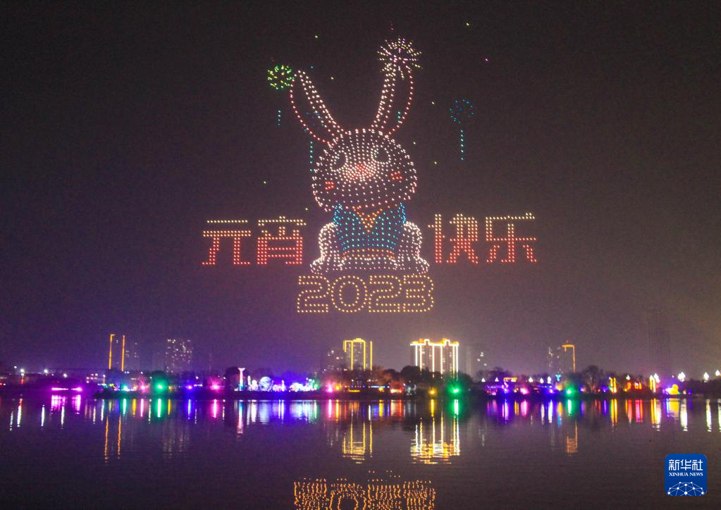 2月5日,河南省南陽市中心城區,游客在觀看無人機編隊在夜空中組成的造型。