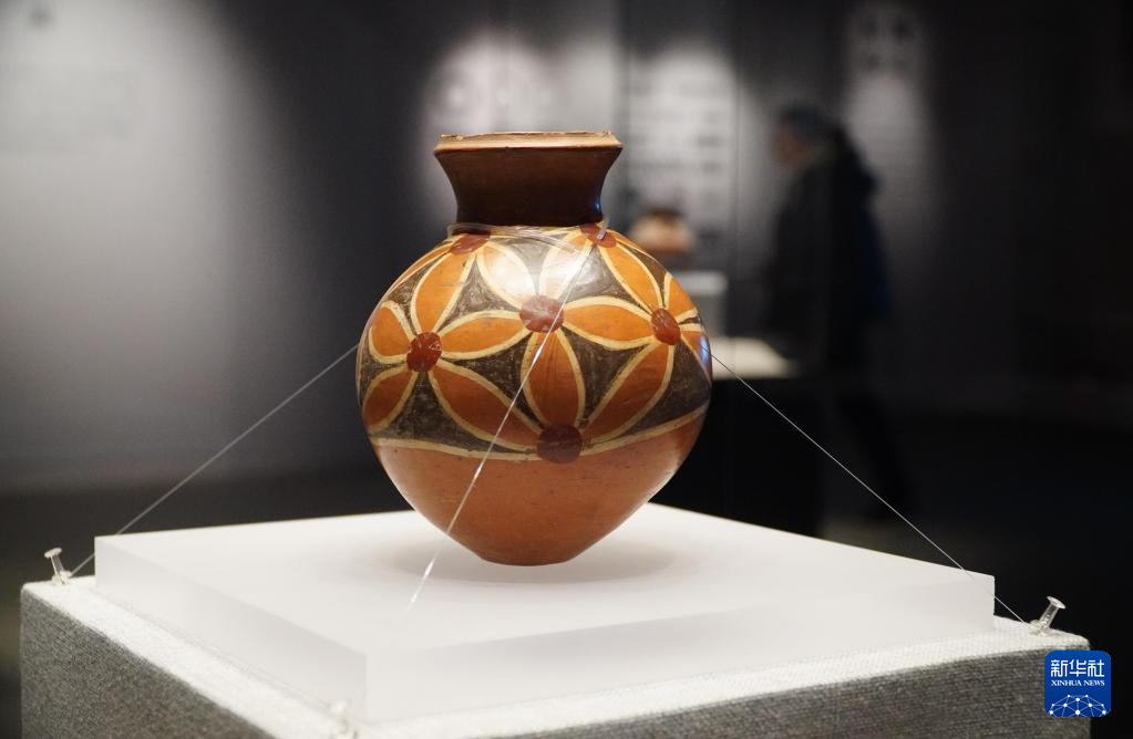 2月9日,在孔子博物館舉行的山東文物精品展上拍攝的山東省文物考古研究院收藏的大汶口文化花瓣紋彩陶壺。