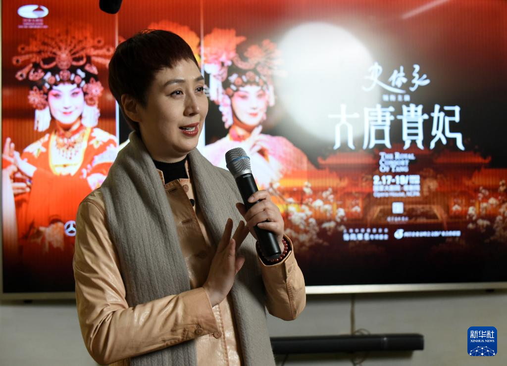 2月14日,京劇演員史依弘在媒體見面會上演唱《大唐貴妃》中的唱段。