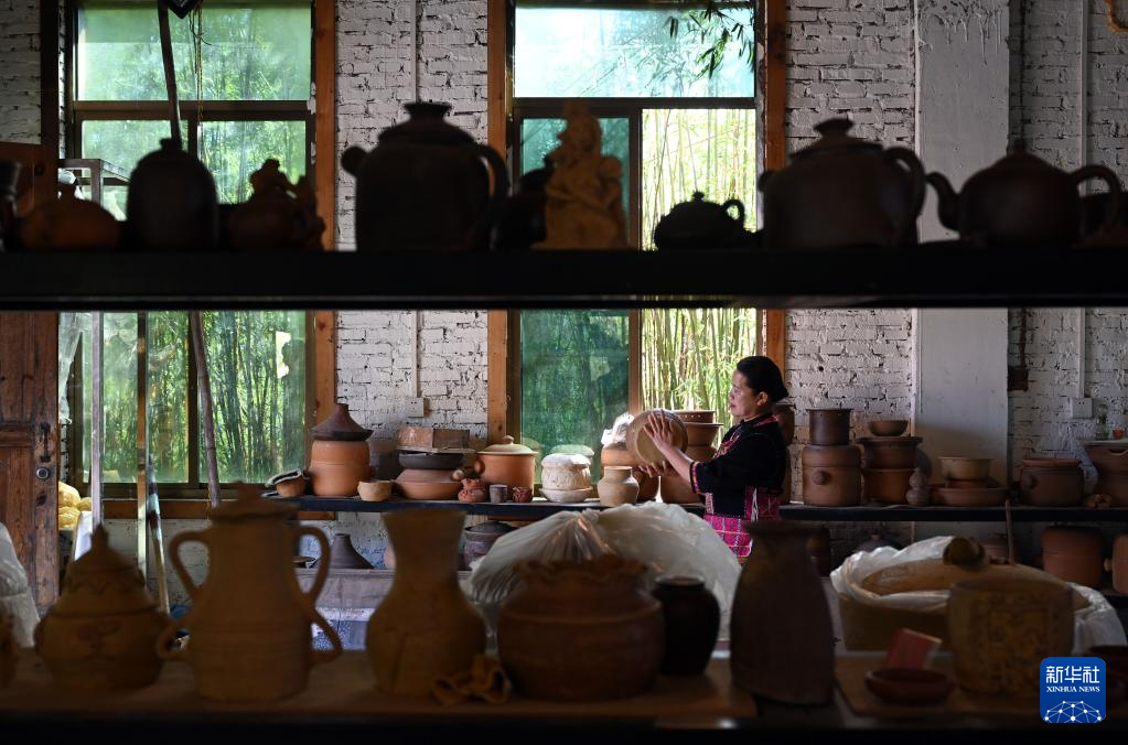 2月18日,劉梅珍在海南昌江石碌鎮保突村非遺黎族制陶館擦拭陶器。