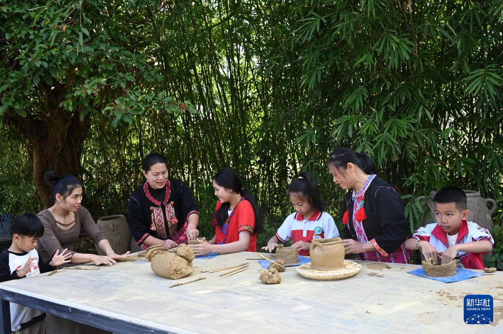 2月18日,在海南昌江石碌鎮保突村非遺黎族制陶館,劉梅珍(左三)指導前來研學的孩子們制作陶器。