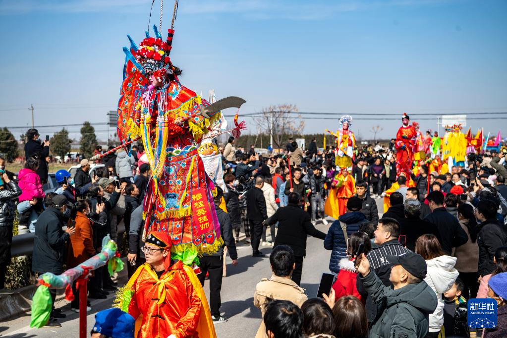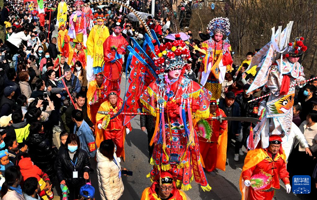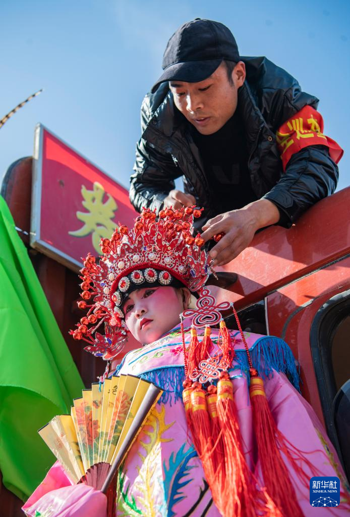 2月19日,西安市臨潼區櫟陽街道卷子村村民在村頭巡回表演“背芯子”。