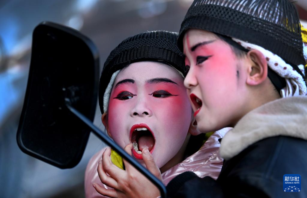 2月19日,西安市臨潼區櫟陽街道卷子村參加“背芯子”表演的兩名小朋友查看自己的化妝效果。