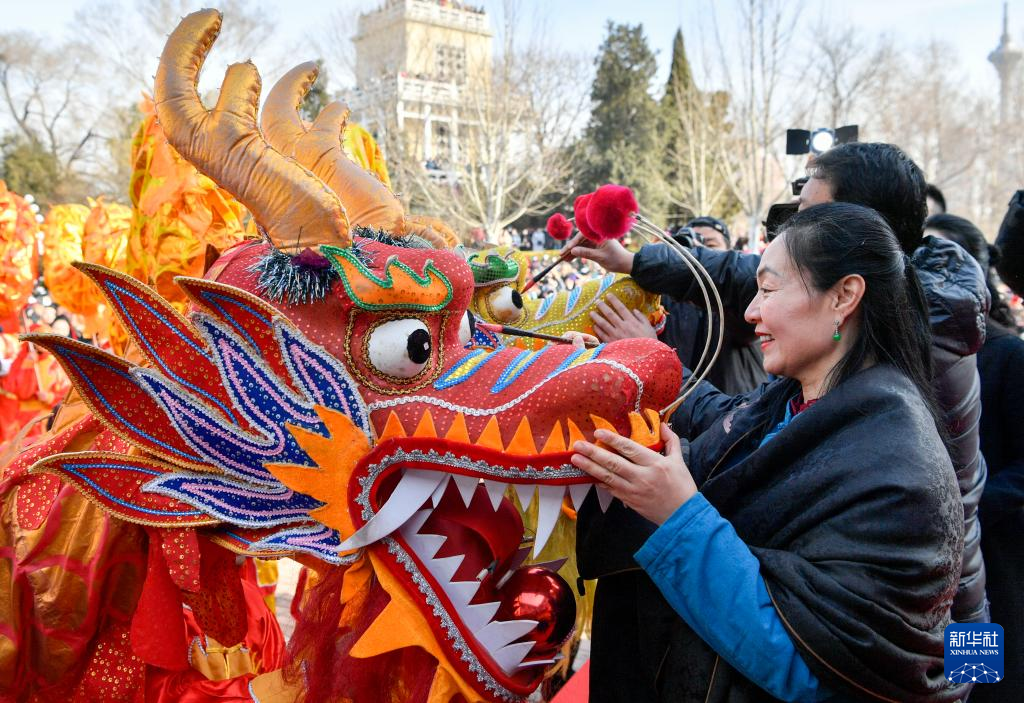2月21日,在天津市水上公園,嘉賓為舞龍點睛。