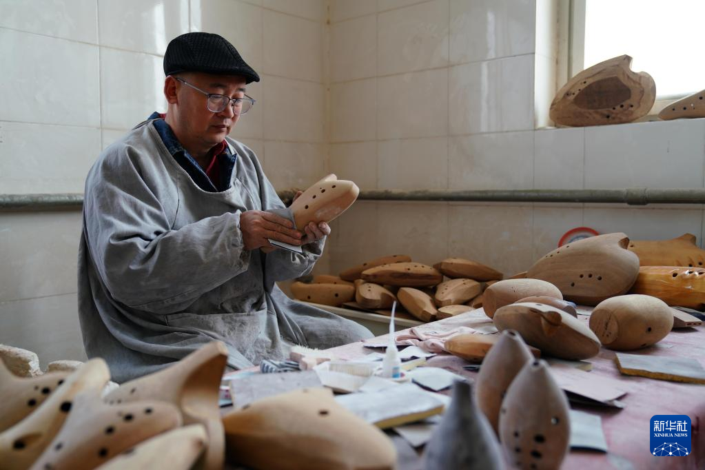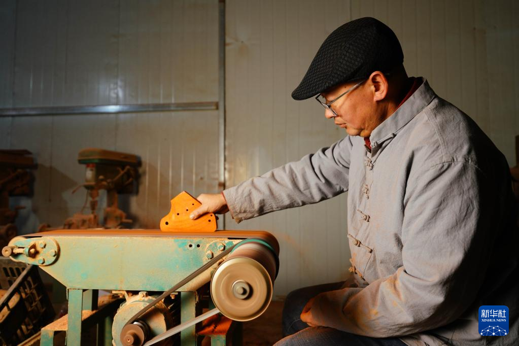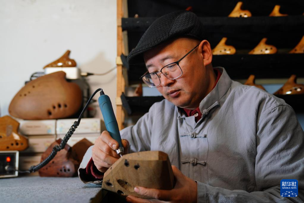 2月20日,陶笛藝人侯義敏打磨木質陶笛半成品。