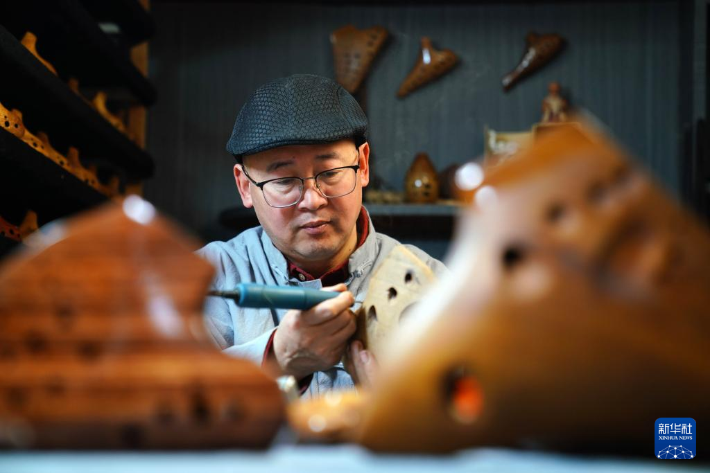 2月20日,陶笛藝人侯義敏在設計木質陶笛。