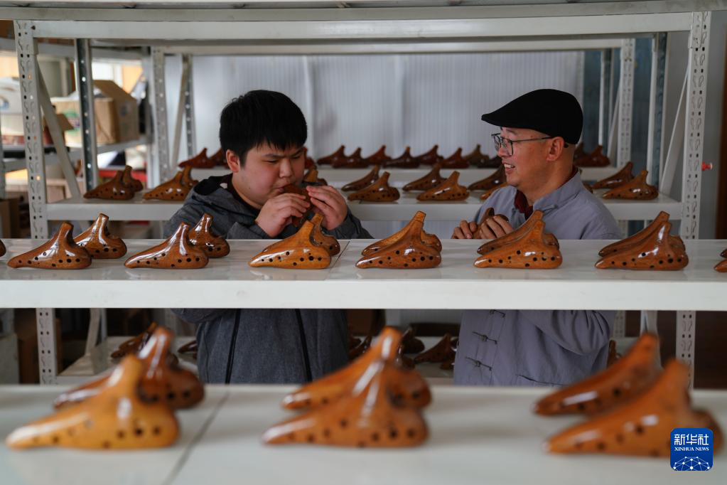 2月20日,陶笛藝人侯義敏(右)和學生李鑫為木質陶笛試音。