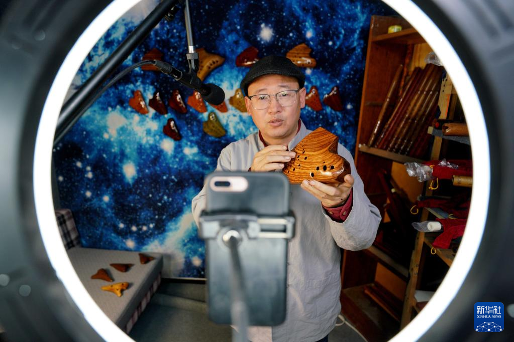 2月20日,陶笛藝人侯義敏在直播中吹奏木質陶笛。