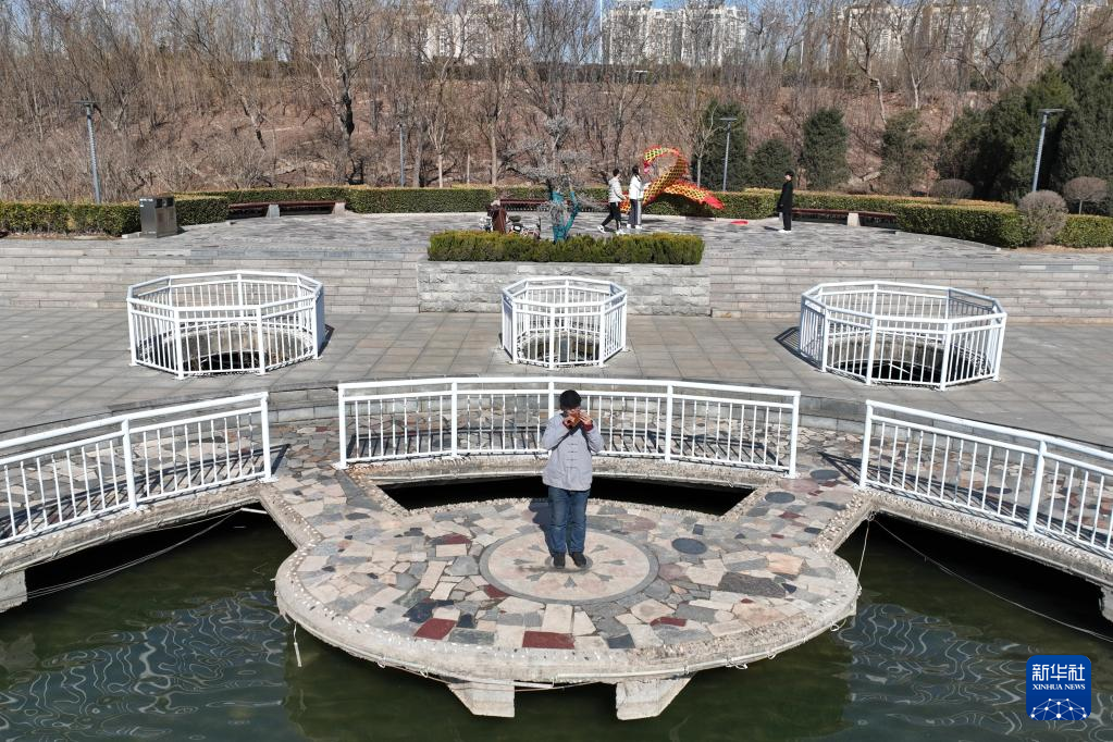 2月20日,陶笛藝人侯義敏在河北省邢臺市一公園內吹奏木質陶笛(無人機照片)。