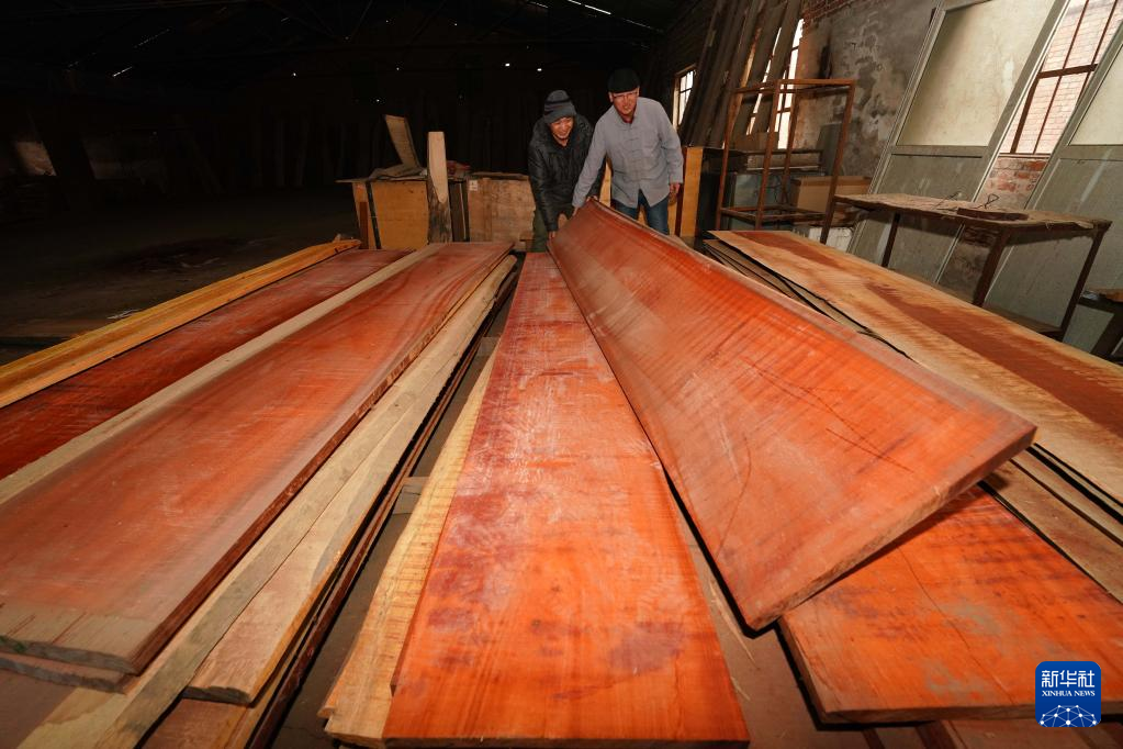 2月20日,陶笛藝人侯義敏(右)挑選制作木質陶笛的木材。