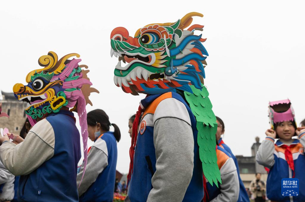 2月21日,在瀘縣屈氏莊園,瀘縣方洞小學的學生們頭戴“紙龍”觀看舞龍表演。