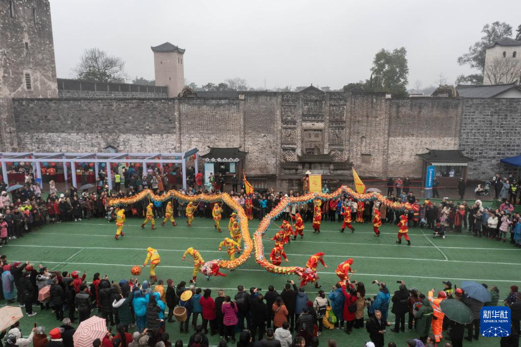 2月21日,在瀘縣屈氏莊園,一支彩龍隊在進行舞龍表演,展示國家級非物質文化遺產“雨壇彩龍”。