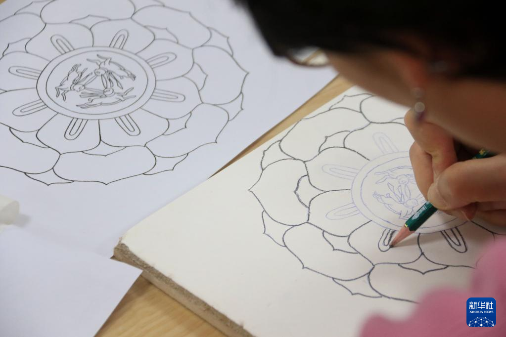 2月23日,學員在敦煌研究院莫高學堂學習臨摹敦煌壁畫。