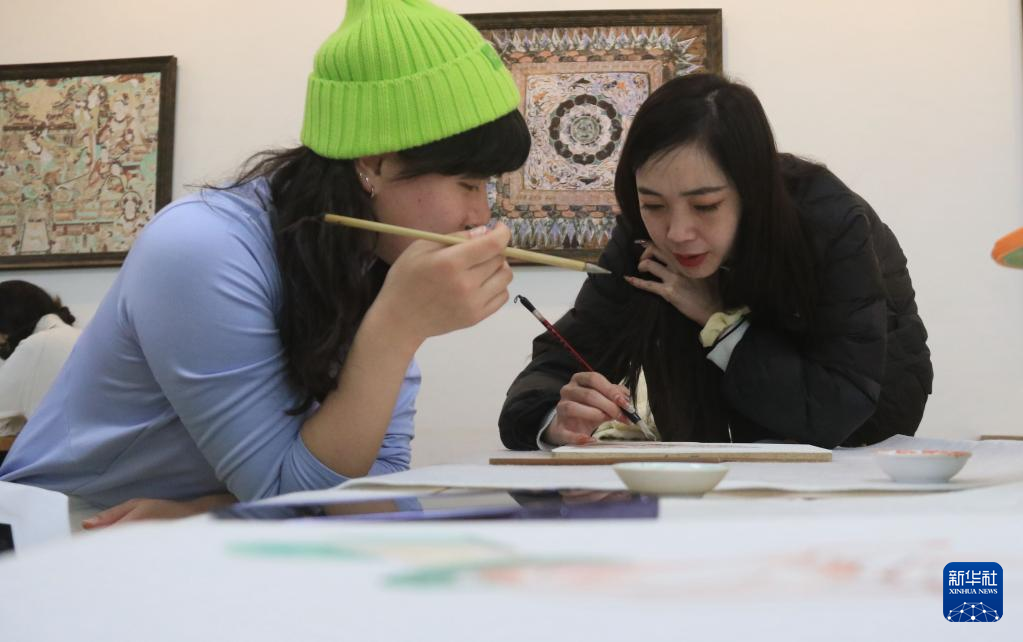 2月23日,在敦煌研究院莫高學堂,研學導師(右)指導學員臨摹敦煌壁畫。