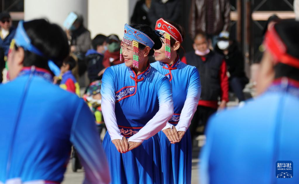 2月27日,在固安縣孔雀大湖廣場,居民表演舞蹈《草原雪》。