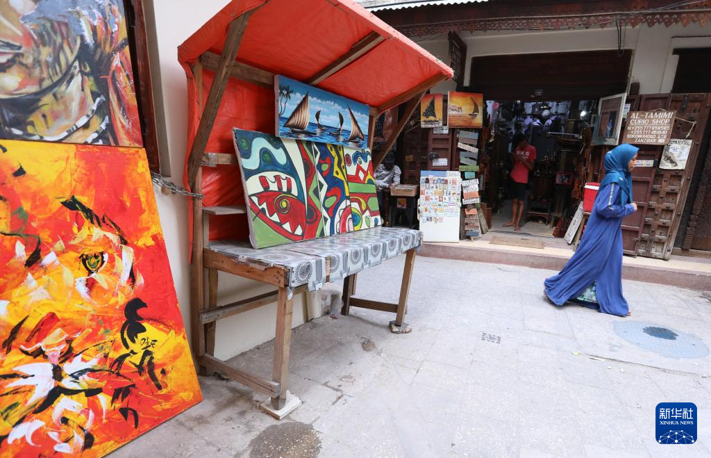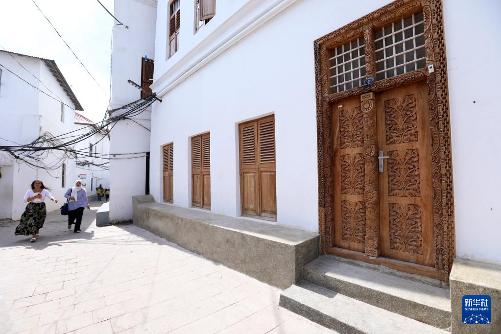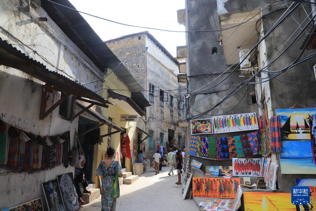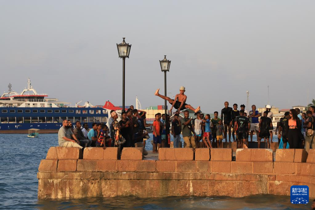 2月21日,人們在桑給巴爾石頭城海邊休閑。