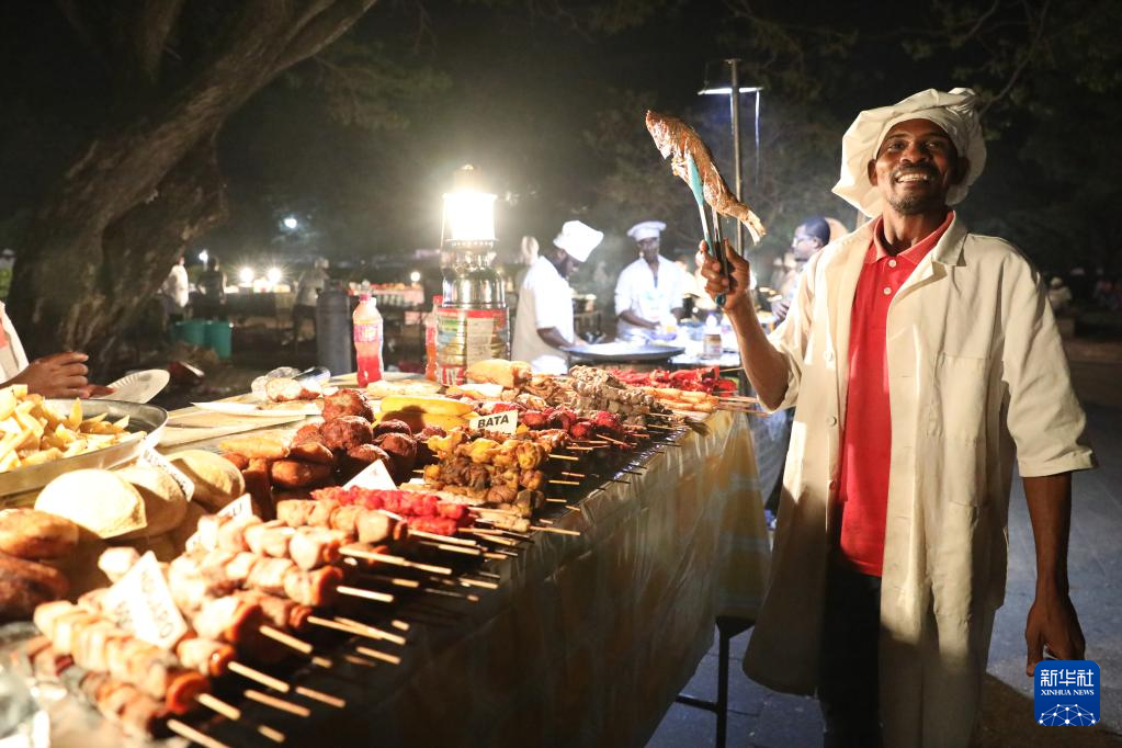 2月21日,在桑給巴爾石頭城夜市,一名攤主展示烤魚。