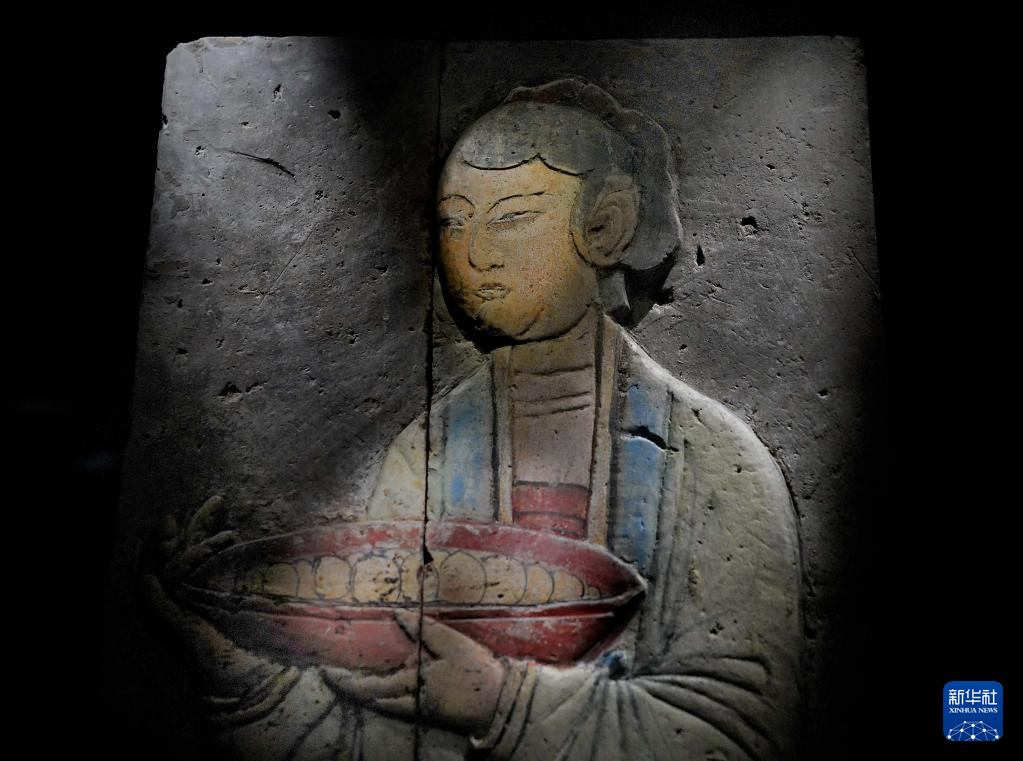 這是在鄭州大象陶瓷博物館舉行的“宋人生活與二十四孝磚雕展”上展出的彩繪侍女俑磚雕局部(3月1日攝)。