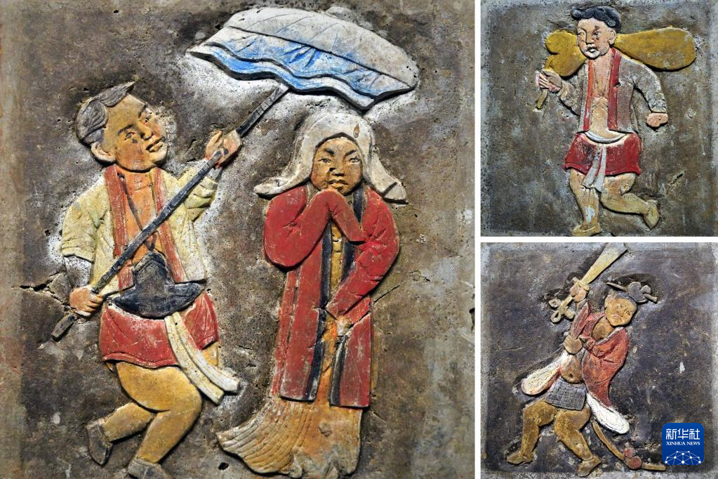 這是在鄭州大象陶瓷博物館舉行的“宋人生活與二十四孝磚雕展”上展出的社火彩繪磚雕(3月1日攝,拼版照片)。