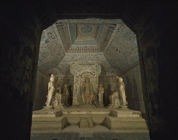 此窟為覆斗頂形窟,中央設馬蹄形佛壇,后有背屏與窟頂西坡相連,佛壇上現存倚坐佛像三身,菩薩三身,迦葉和二身力士均為宋代的雕塑。這些塑像豐腴飽滿,形象、服飾頗俱唐代遺風,規模則超過了唐代,是宋代塑像的代表作。佛壇塑彌勒三會彩塑,現存倚坐彌勒佛像三身,分別塑在佛壇西、南、北三邊,成三角鼎足之形,以示彌勒三會,還有菩薩下三身,弟子像一身,分別侍立三佛之側,另塑力士像兩身,肩負彌勒佛座。是莫高窟保存最好的一組宋代彩塑,造型衣飾有唐代彩塑之余韻,為宋代塑像之精品。