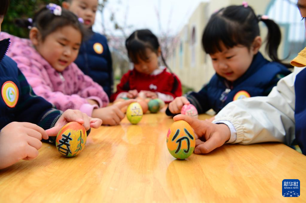 3月20日,江蘇省無錫市陽山中心幼兒園的小朋友在玩“立蛋”游戲。