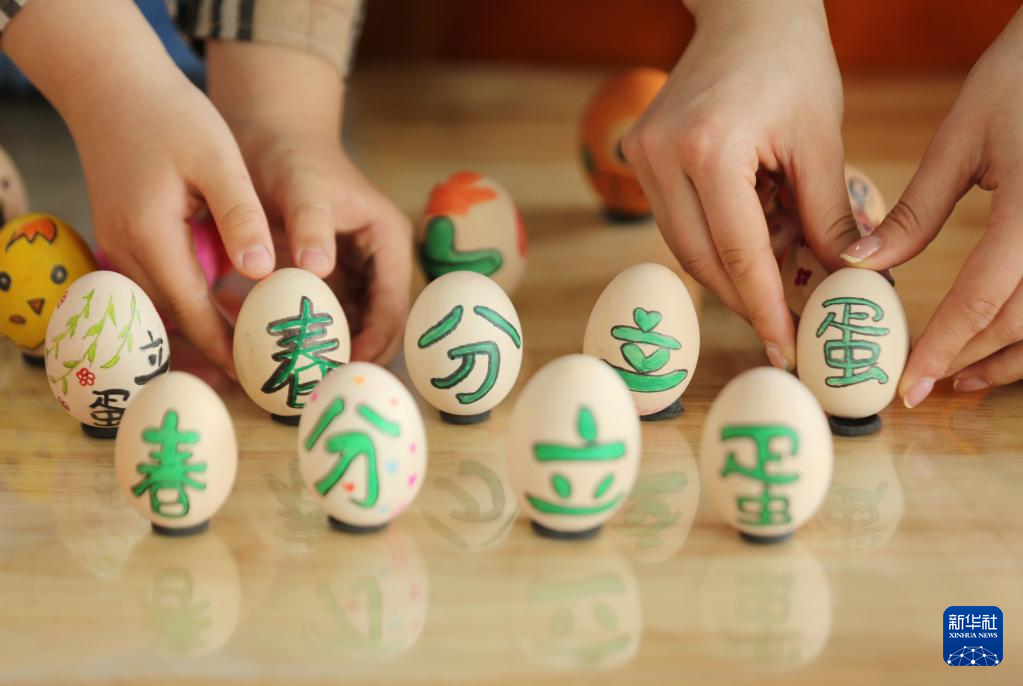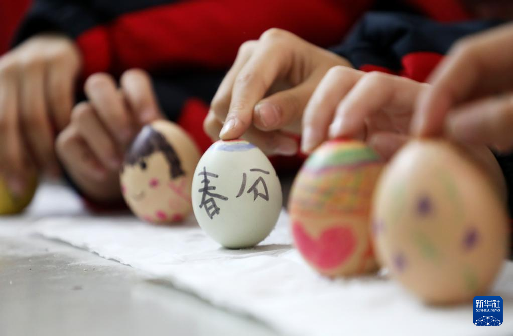 3月20日,在浙江省金華市婺城區紅湖路小學,學生體驗立蛋民俗。