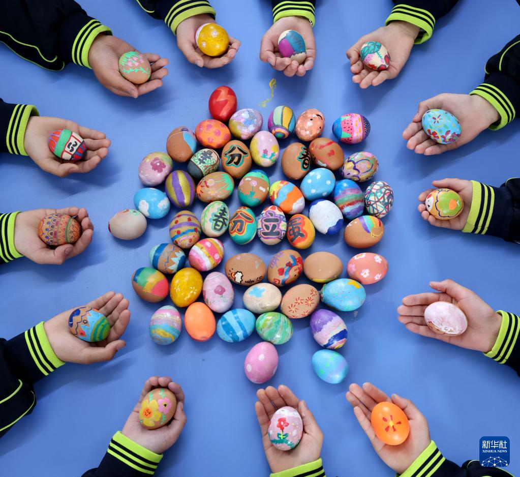 3月20日,在山東省棗莊市江山實驗學校,小學生們在展示繪制的“彩蛋”。