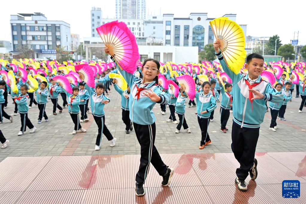 3月22日,在柳城縣實驗小學總部,學生在課間跳起彩調廣播操。