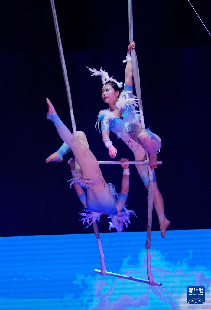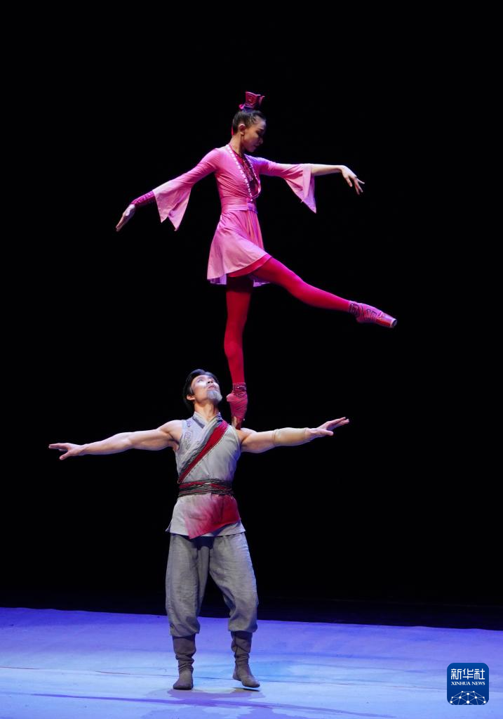 3月21日,在位于山東省濟南市的山東省會大劇院,演員表演雜技節目《雙人吊子》。