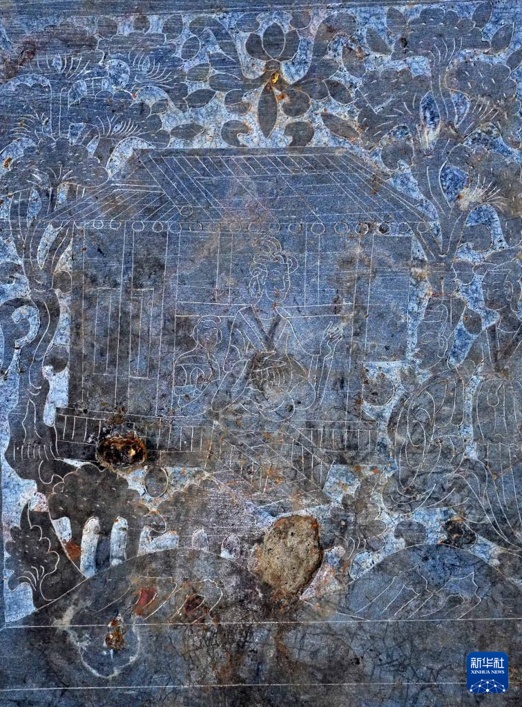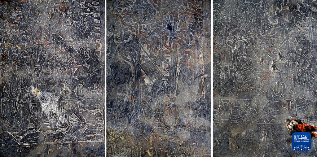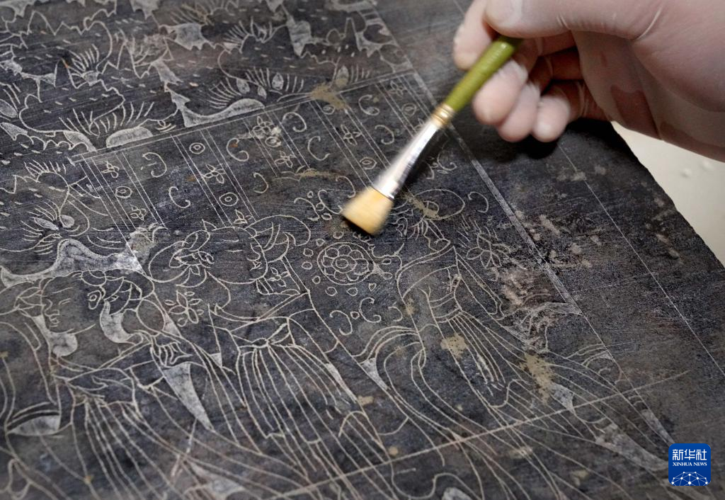 這是圍屏石棺床石屏風上的圖像(3月15日攝)。