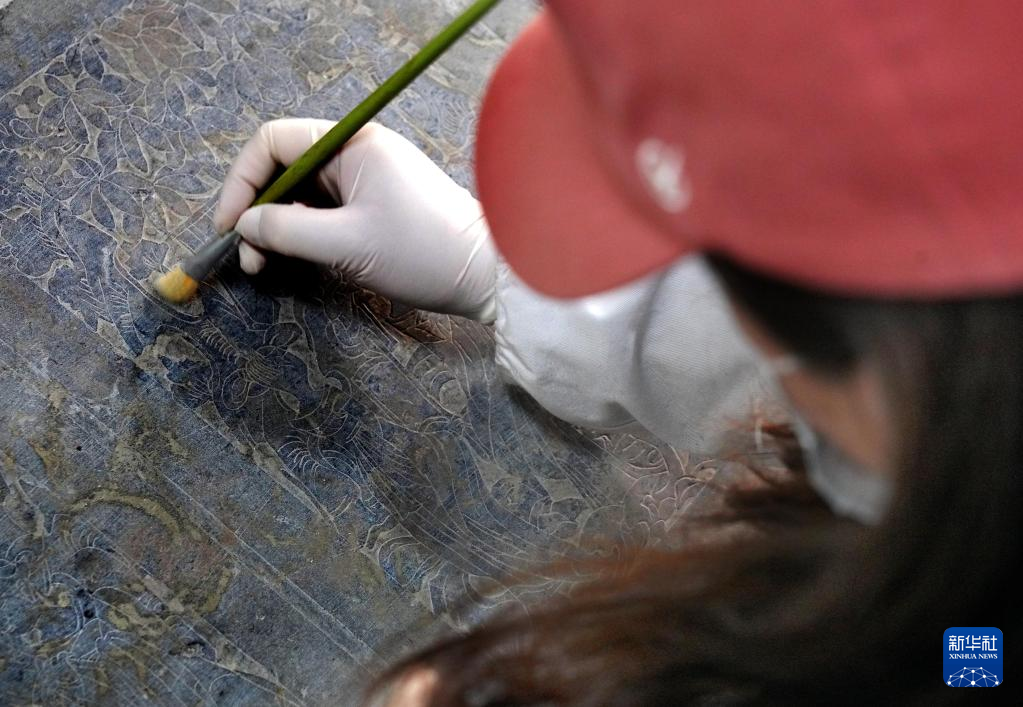工作人員在清理圍屏石棺床石屏風上的圖像(3月15日攝)。