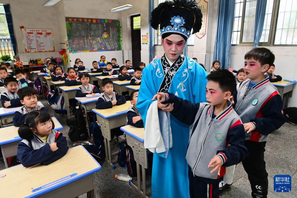 當日是世界戲劇日,江西省宜春市萬載縣花燈戲劇團演員來到當地第二小學,為學生們講解和表演花燈戲,讓孩子們近距離感受傳統戲劇文化的魅力。