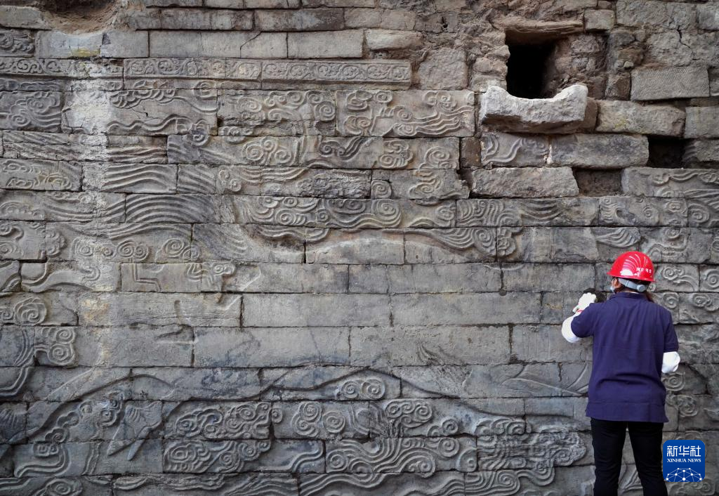 工作人員在清理河南開封州橋遺址出土的巨幅石雕祥瑞壁畫(2022年9月21日攝)。